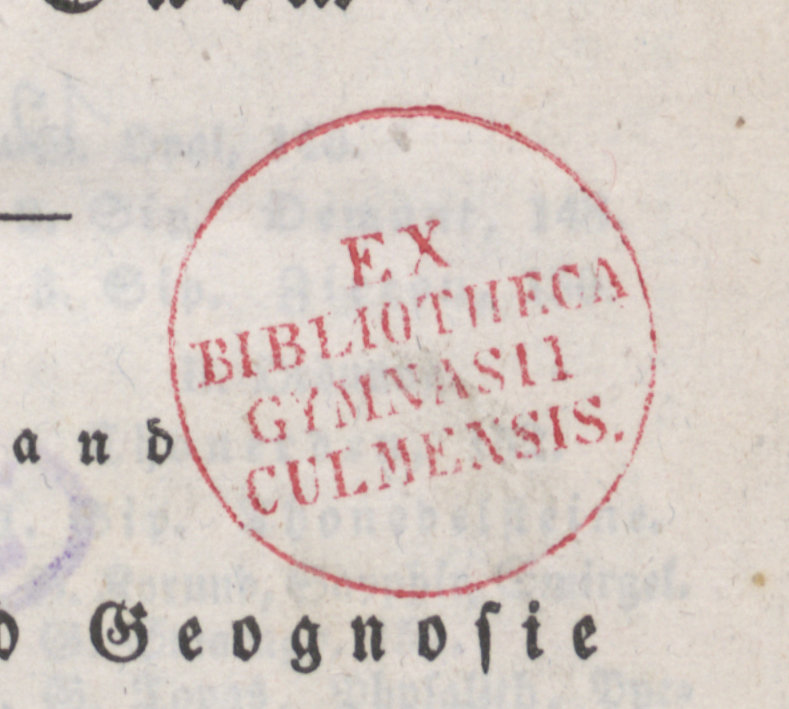 Mineralogie und Geognosie - pieczątka okrągła (czerwona) Ex Bibliotheca Gymnasii Culmensis.