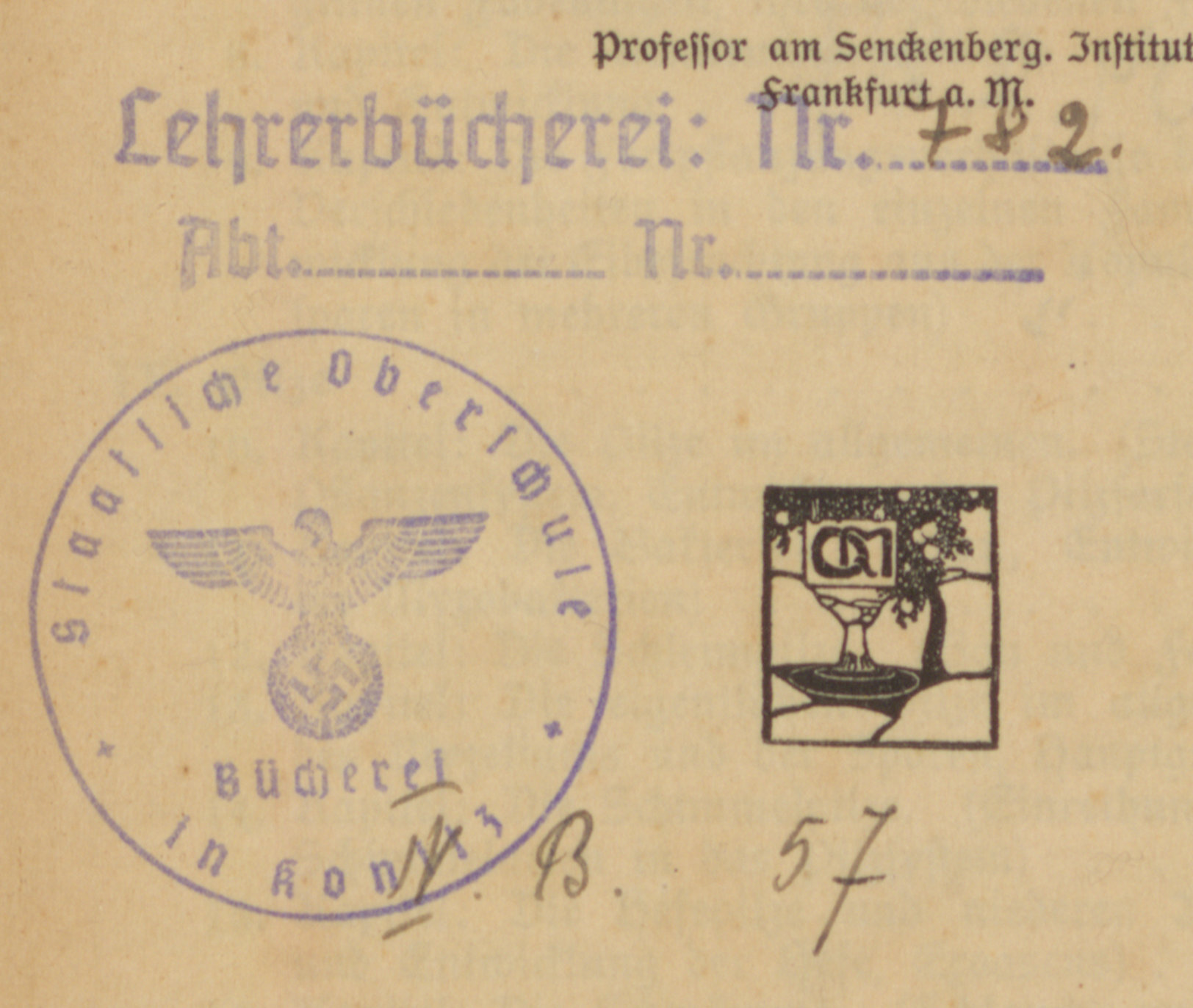 Kryptogamen : Algen, Pilze, Flechten, Moose und Farnpflanzen - pieczątka z sygnaturą oraz pieczątka okrągła: Bücherei Staatlische Oberschule in Konitz