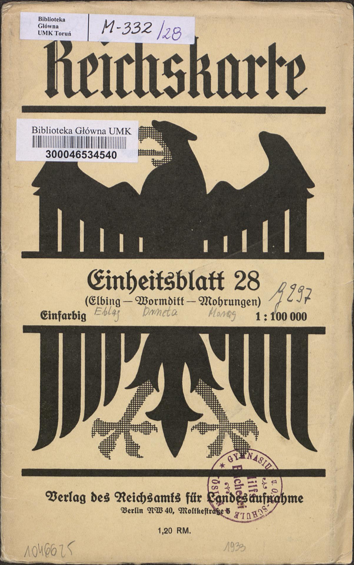 Elbing-Wormditt-Mohrungen ; Reichskarte Einheitsblatt 28 (Elbing-Wormditt-Mohrungen) 1:100 000 - strona z pieczątką