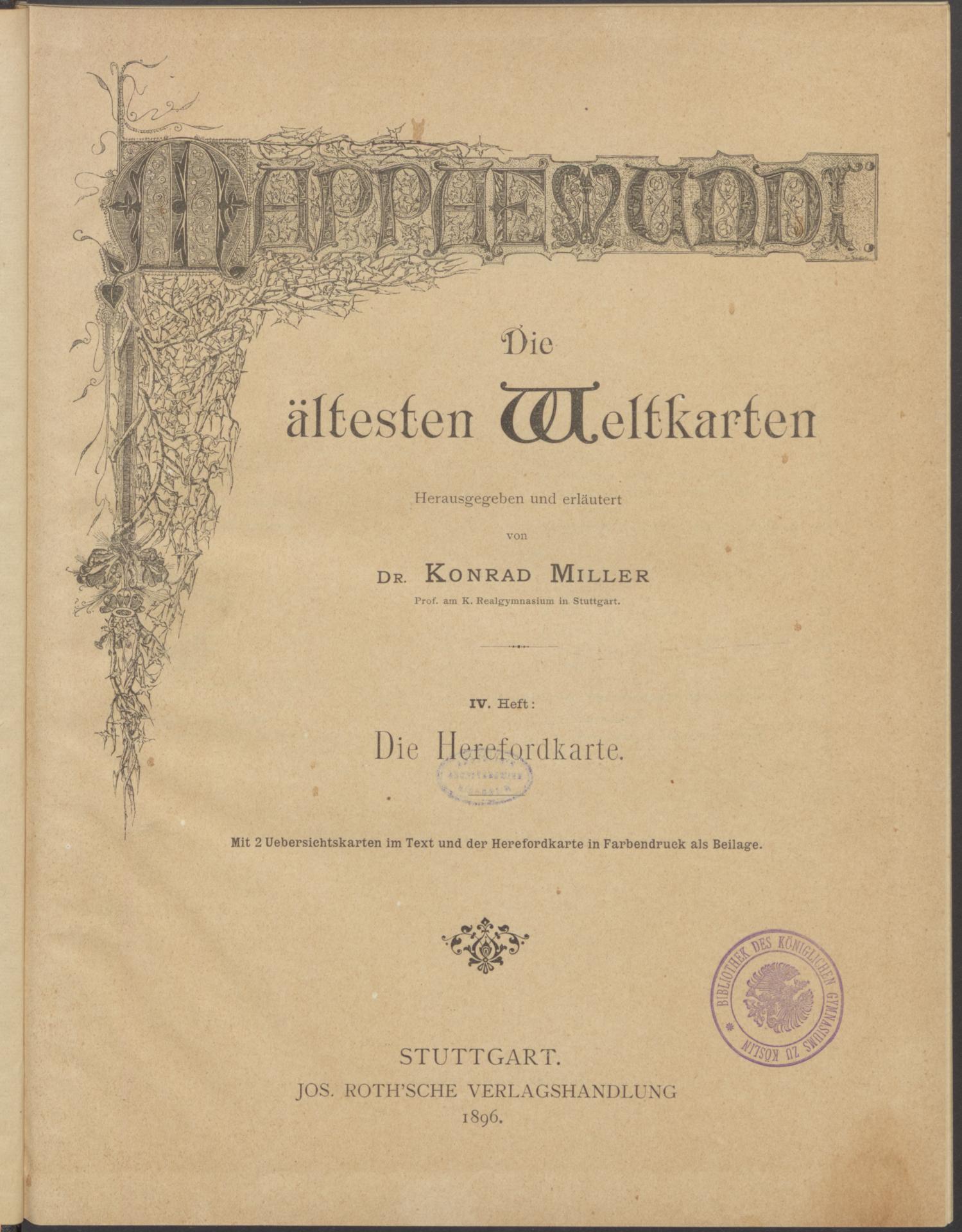 Mappaemundi die ältesten Weltkarten. Hetf 4, Die Herefordkarte ; Herefordkarte - strona tytułowa z pieczątką