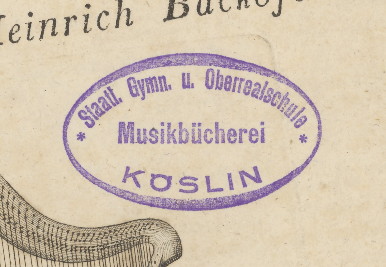 Anleitung zum Harfenspiel mit eingestreuten Bemerkungen über den Bau der Harfe - owalna pieczęć fioletowa: Staatl. Gymn. u. Oberrealschule Musikbücherei Köslin