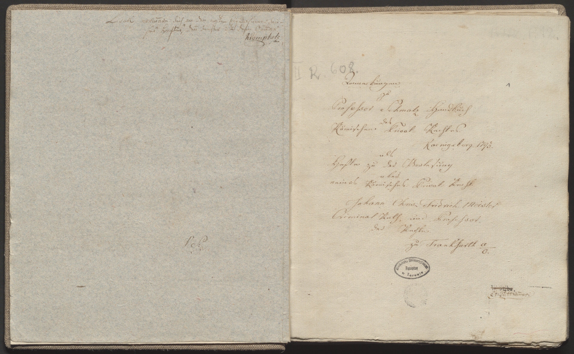 Part of Anmerkungen zu Professor Schmalz Handbuch des Römischen Privat-Rechtes, Koenigsberg 1793 als Hefte zu der Vorlesung über reines Römisches Privat-Recht Johann Chris[tian] Friedrich Meister Criminal Rath und Professor der Rechte zu Frankfurt [an der Oder]