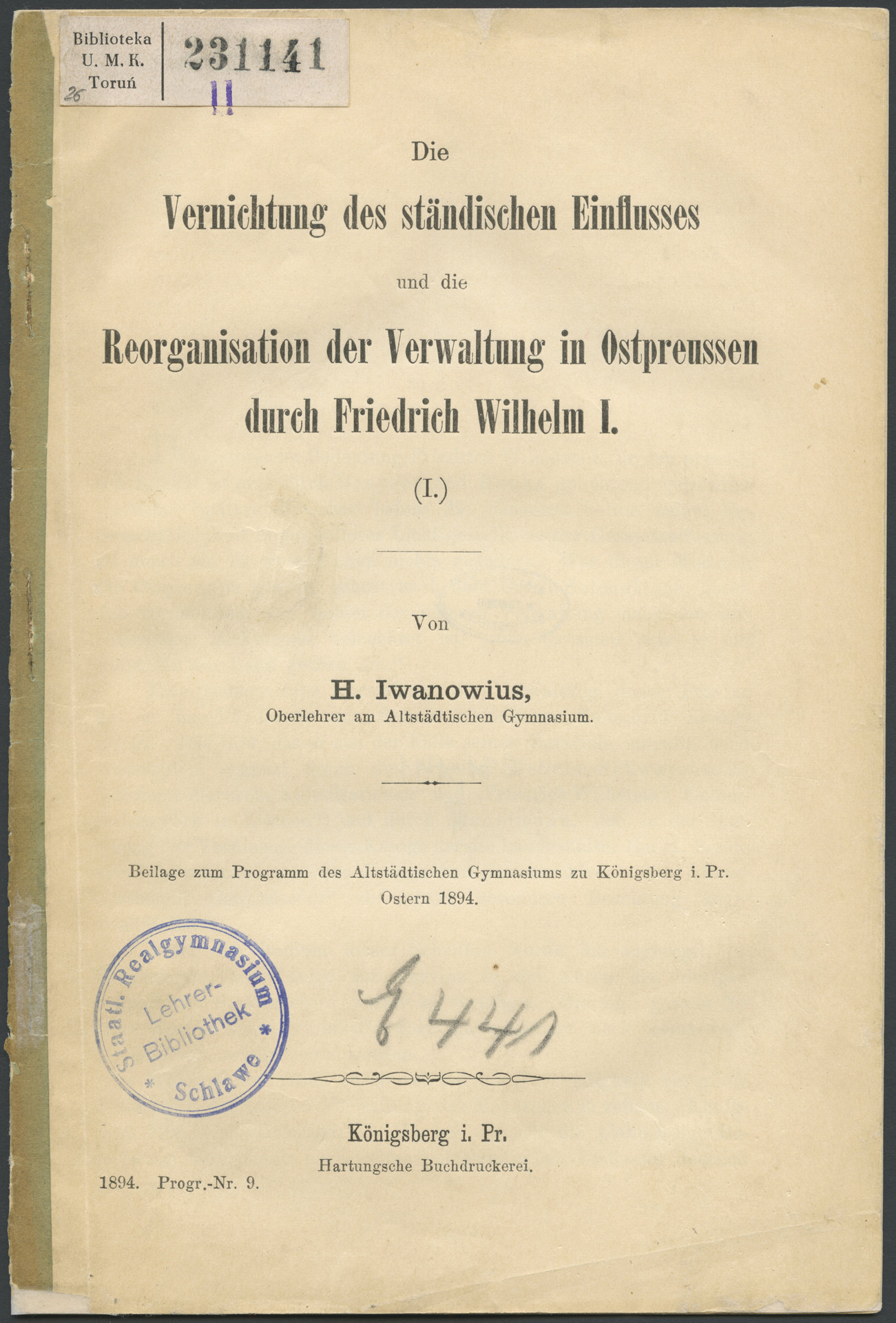 Die Vernichtung des ständischen Einflusses und die Reorganisation der Verwaltung in Ostpreussen durch Friedrich Wilhelm I - strona tytułowa z pieczątką