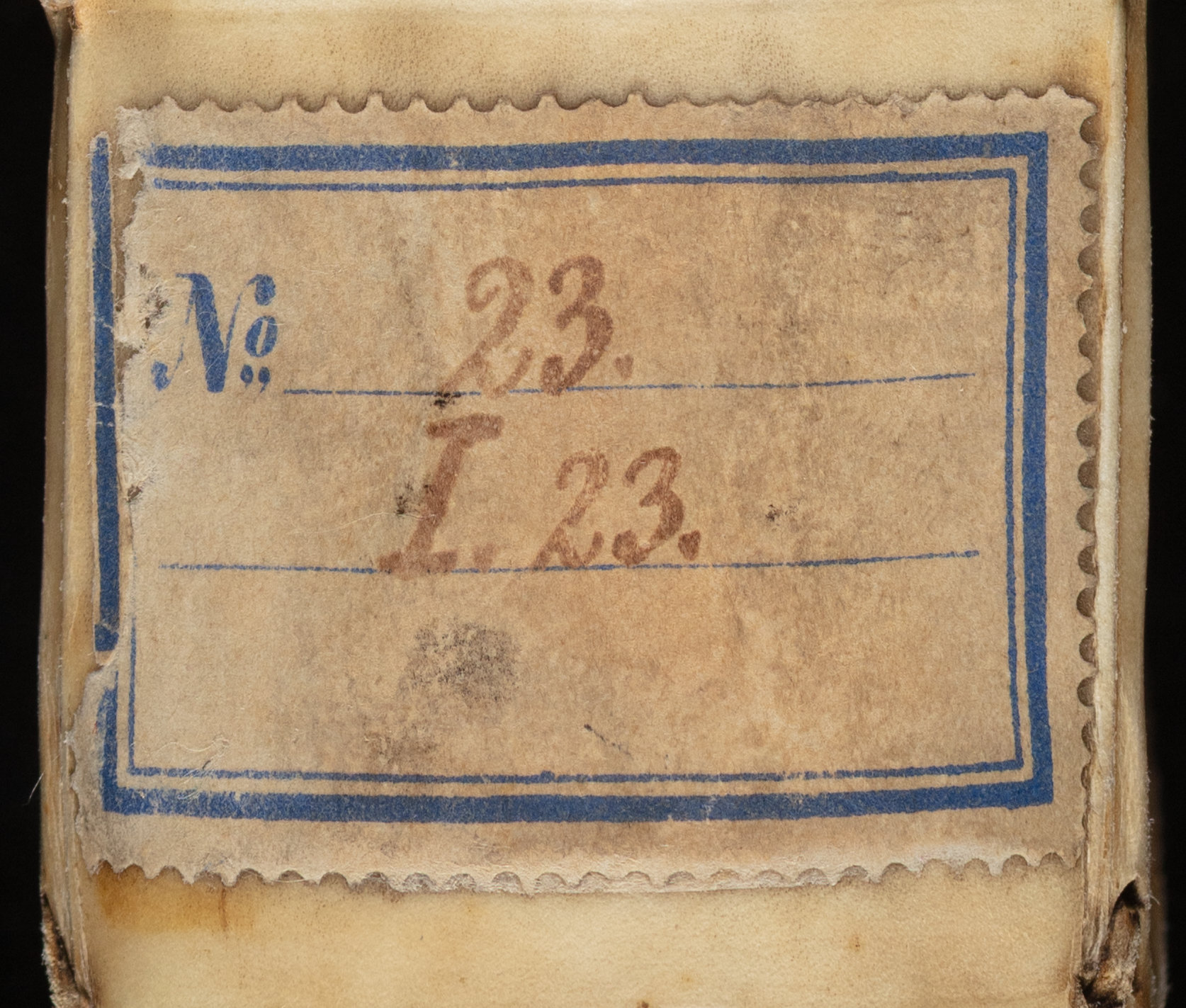 Tractatvs De Appellationibvs Libri Octo, In Qvibvs, Qvae Ex Ivre Civili Et Pontificio, Ad Praxin Maxime Gallicanam, Germanam & Romanam, pertinere videbantur, obseruata sunt ... - ząbkowana nalepka na dole grzbietu z wydrukowaną niebieską podwójną obwódką i wpisaną sygnaturą