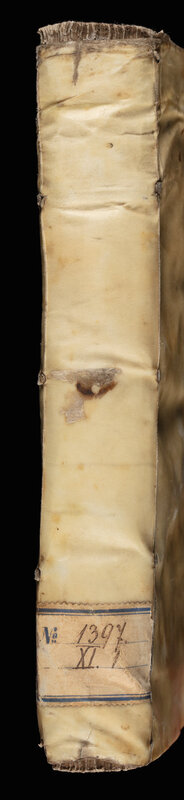 Christophori Clavii Bambergensis E Societate Iesv Geometria Practica - grzbiet z ząbkowaną nalepką na dole z wydrukowaną niebieską podwójną obwódką i wpisaną sygnaturą