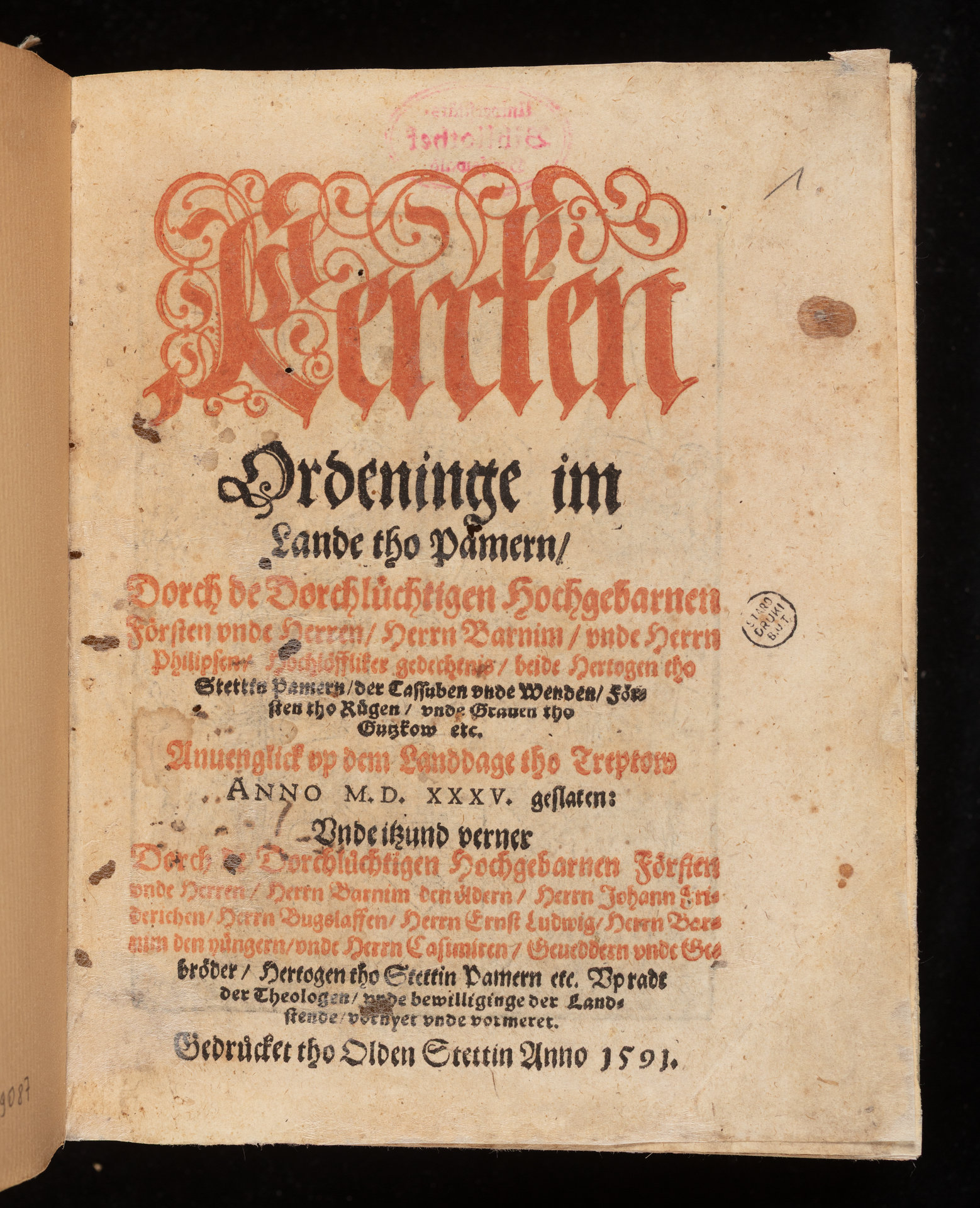 Part of Kercken Ordeninge im Lande tho Pamern : Dorch [...] Herrn Barnim, vnde Herrn Philipsen, Hochlöffliker gedechtnis, beide Hertogen tho Stettin [...], Anuenglick vp dem Landdage tho Treptow Anno M. D. XXXV geslaten [...].
