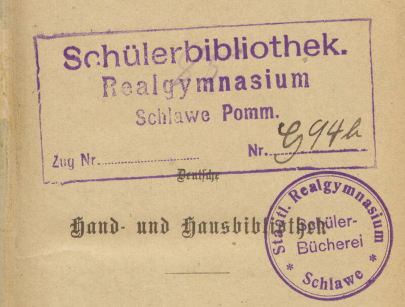 2. Fioletowa, prostokątna pieczątka: Schülerbibliothek Realgymnasium Schlawe Pomm. Zug Nr. …….. Nr…….