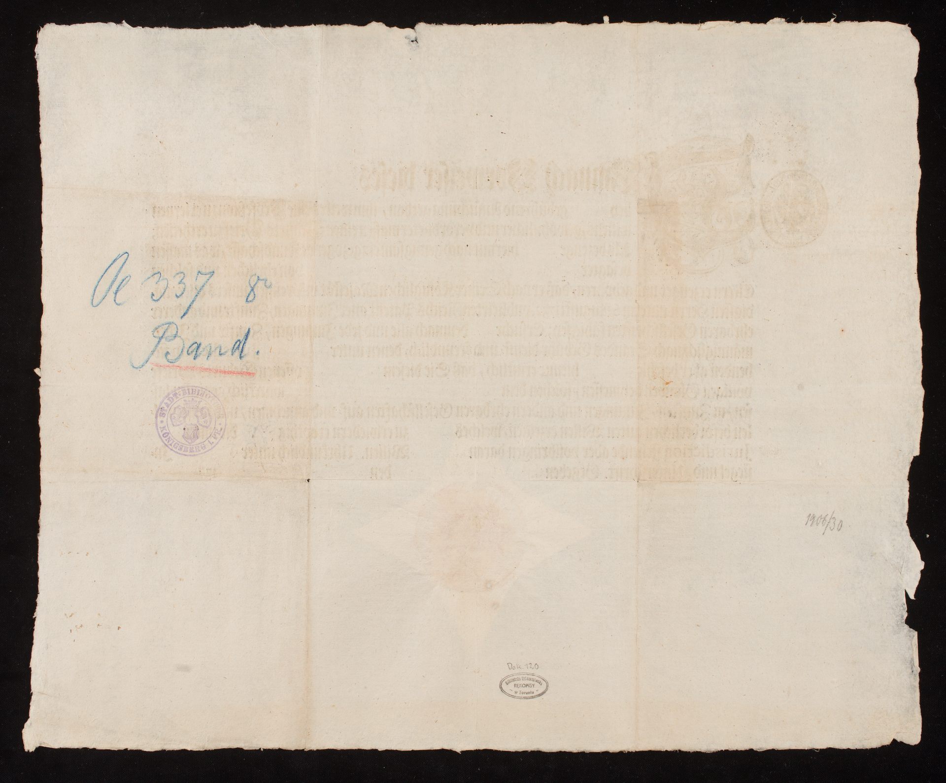 Burmistrz i rada miejska miasta Królewiec wydają poręczenie dla Johanna Michaela Banda z zaleceniem przyjęcia go do organizacji cechowych - strona z sygnaturą i pieczęcią