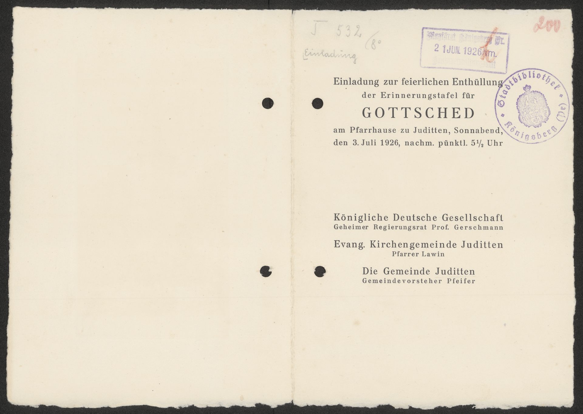 Evangelische Kirchengemeinde Juditten. Zaproszenie okolicznościowe - pieczątka okrągła: Stadtbibliothek Königsberg (Pr)