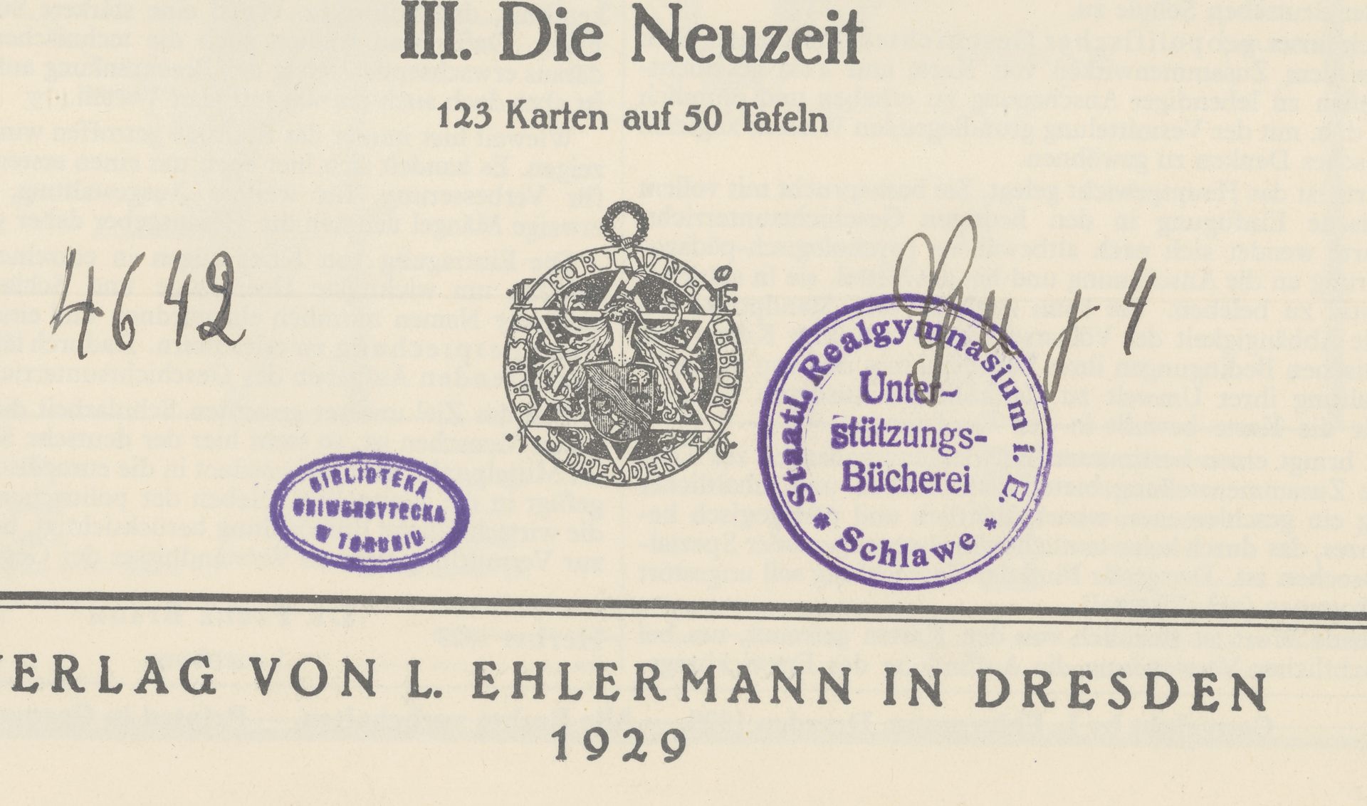 Geopolitischer Geschichtsatlas * III. Die Neuzeit - okrągła pieczątka: Staatl. Realgymnasium i. E. Schlawe Unter-Stützungs-Bücherei