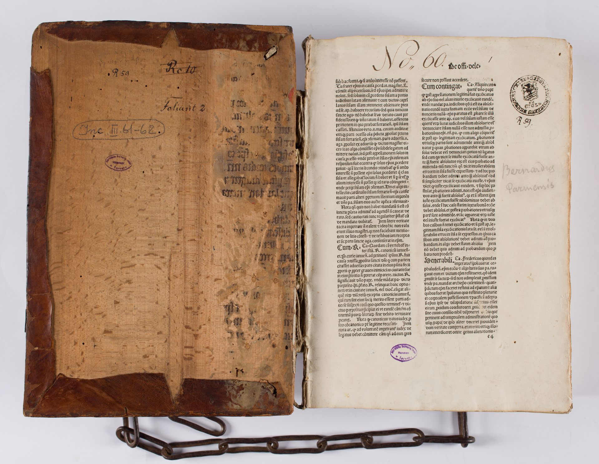 Casus longi super quinque libros Decretalium / Bernardus Parmensis - okładzinówka (deska) i pierwsza zachowana karta