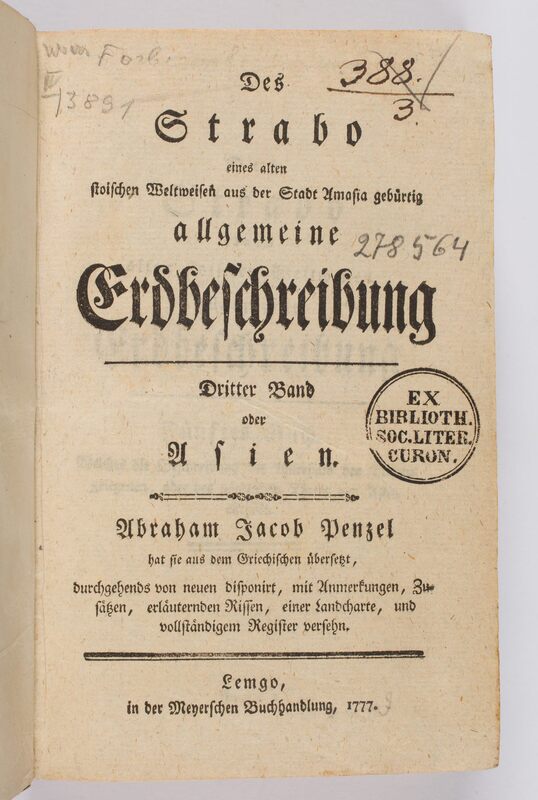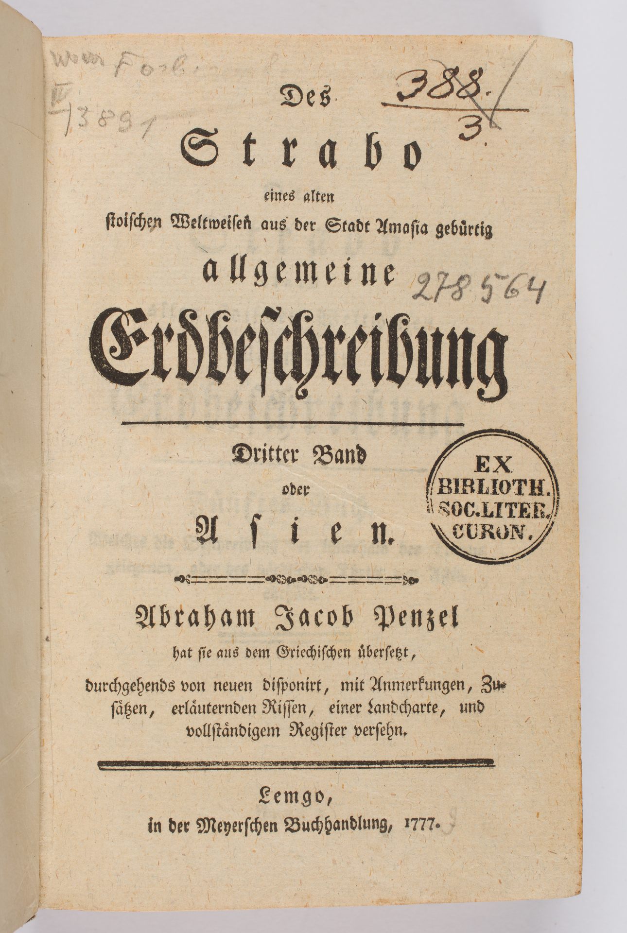 Des Strabo, eines alten stoischen Weltweisen aus der Stadt Amasia gebürtig allgemeine Erdbeschreibung : 3 : Dritter Band oder Asien - strona tytułowa z zapiską proweniencyjną i okrągłą czarną pieczątką: EX BIBLIOTH. SOC. LITER. CURON.