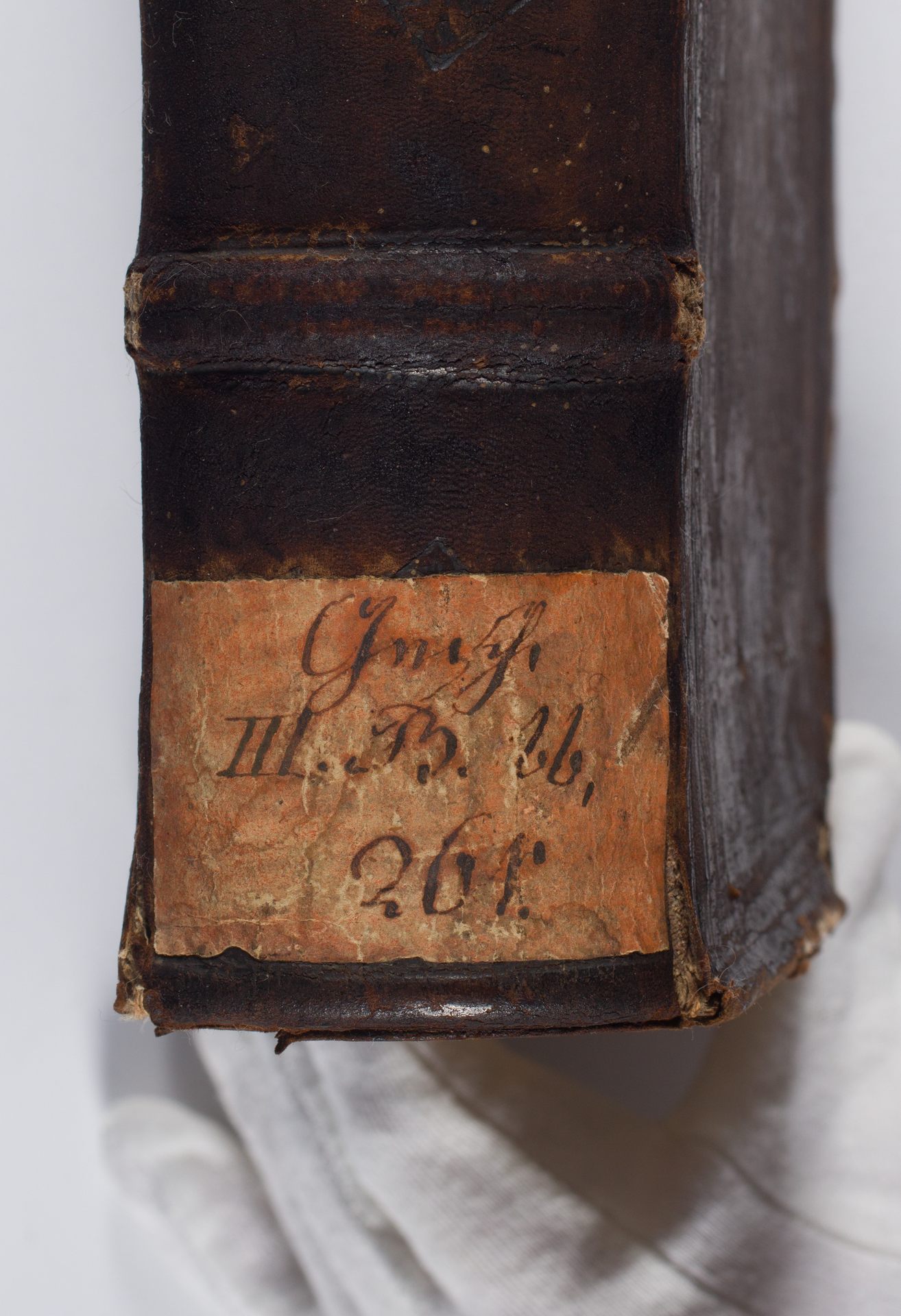 Sächsisch Chronicon : Darinnen Ordentlich begriffe[n] die Fürnemste[n] vnd denckwirdigsten Sachen, so von anbegin der Welt sich begeben ... - czerwona nalepka z odręczną sygnaturą na grzbiecie: Gesch. III. B. bb. 261.