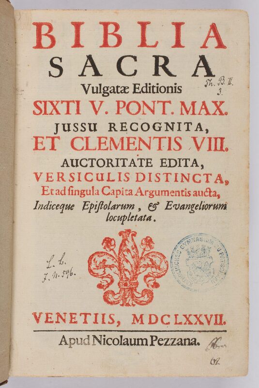 Part of Biblia Sacra Vulgatae Editionis Sixti V. Pont. Max. Jussu Recognita, Et Clementis Viii. Auctoritate Edita, Versiculis Distincta, Et ad singula Capita Argumentis aucta, Indiceque Epistolarum, et Evangeliorum locupletata.