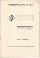 Propozycje dla Torunia : wystawa projektów rzeźb pleneru zorganizowanego z okazji 500 rocznicy urodzin Mikołaja Koprenika listopad - grudzień 1971 Zawiera biogramy uczestników pleneru rzeźbiarskiego, spis ich prac oraz fotografie projektów rzeź. Słowo wstępne Tadeusz Zakrzewski. -