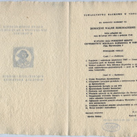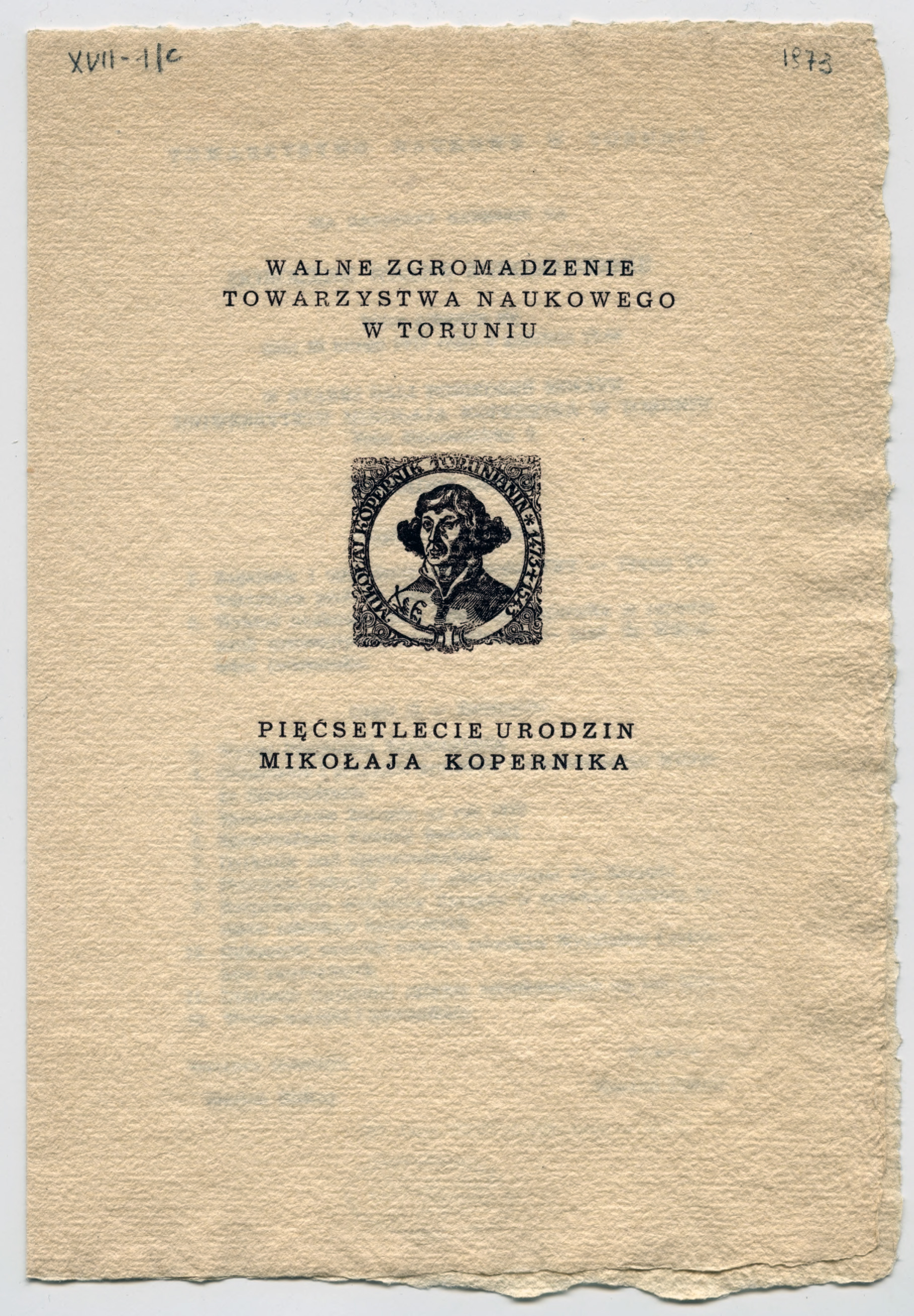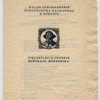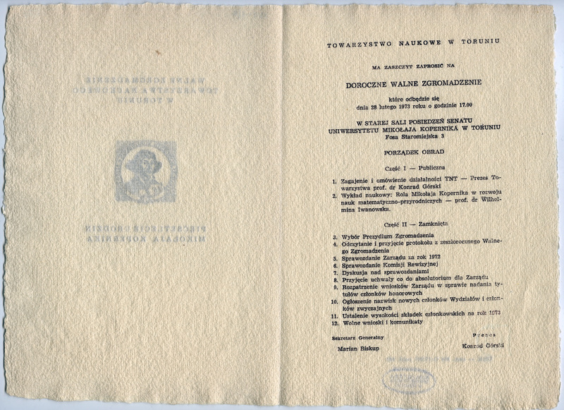 Pod tekstem zaproszenia i programem podpisani: Serkretarz Generalny Marian Biskup, Prezes Konrad Górski. ; Tytuł nadany przez katalogującego. ; Na zewnętrznej stronie zaproszenia portret popiersiowy Mikołaja Kopernika wykonany w technice drzeworytu. ; Na zewnętrznej stronie zaproszenia tytuł: Walne Zgromadzenie Towarzystwa Naukowego w Toruniu - Pięćsetlecie urodzin Mikołaja Kopernika ; Druk ulotny - zaproszenie wraz z programem walnego zgromadzenia, które miało miejsce dnia 28 lutego1973 roku o godzinie 17 w starej sali posiedzeń Senatu UMK, ul. Fosa Staromiejska 3. ; 14,8x22 cm. ; [1] karta złożona