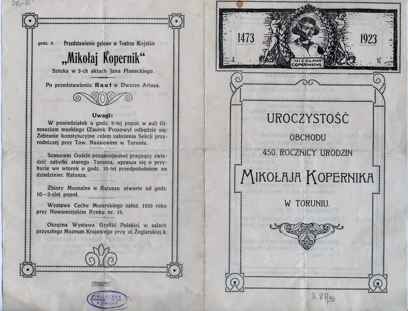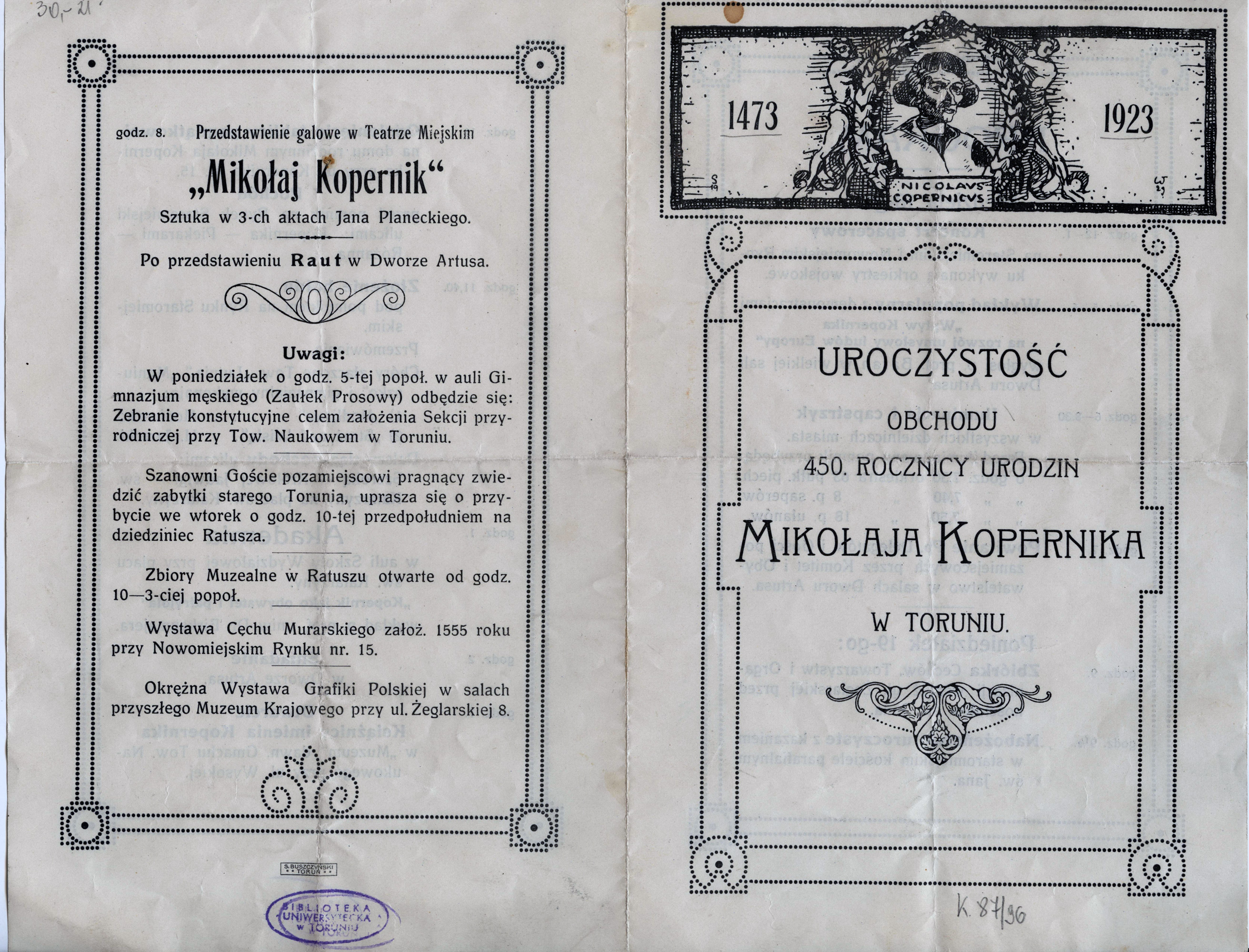 W 1923 roku władze miejskie Torunia przygotowały bogaty program obchodów 450. rocznicy urodzin znakomitego torunianina