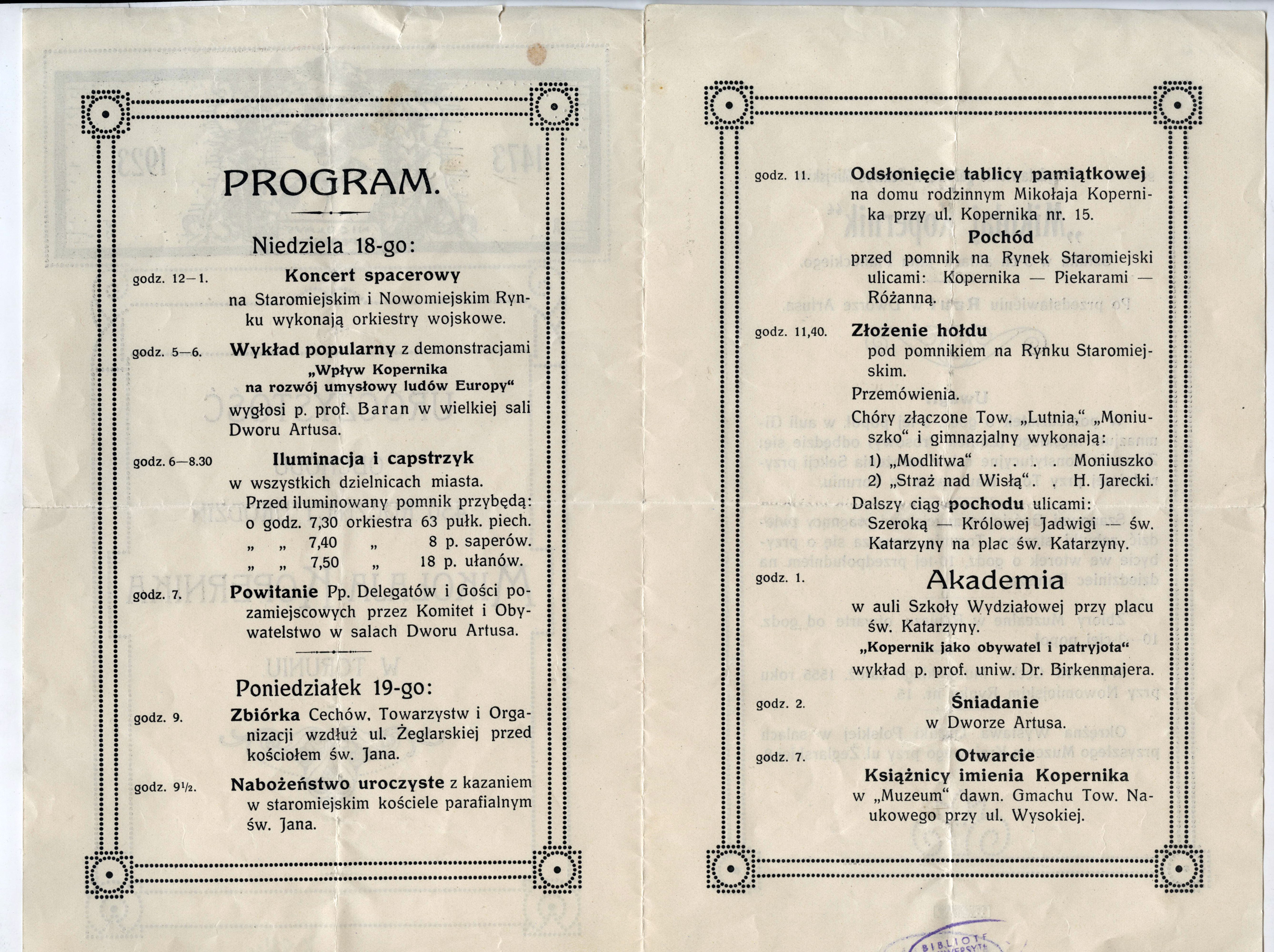 Program uroczystości obchodów 450. Rocznicy urodzin Mikołaja Kopernika w Toruniu w 1923 roku