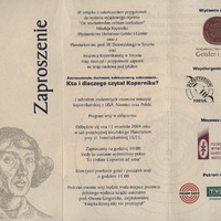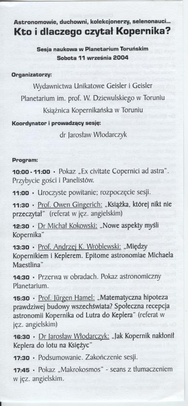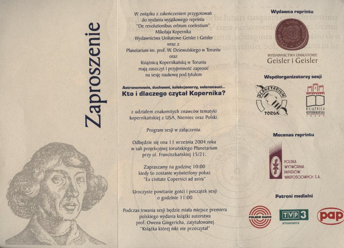 Zaproszenie na sesję naukową pod tytułem “Astronomowie, duchowni, kolekcjonerzy, selenonauci... Kto i dlaczego czytał Kopernika”, 11 września 2004 roku w sali projekcyjnej toruńskiego Planetarium.