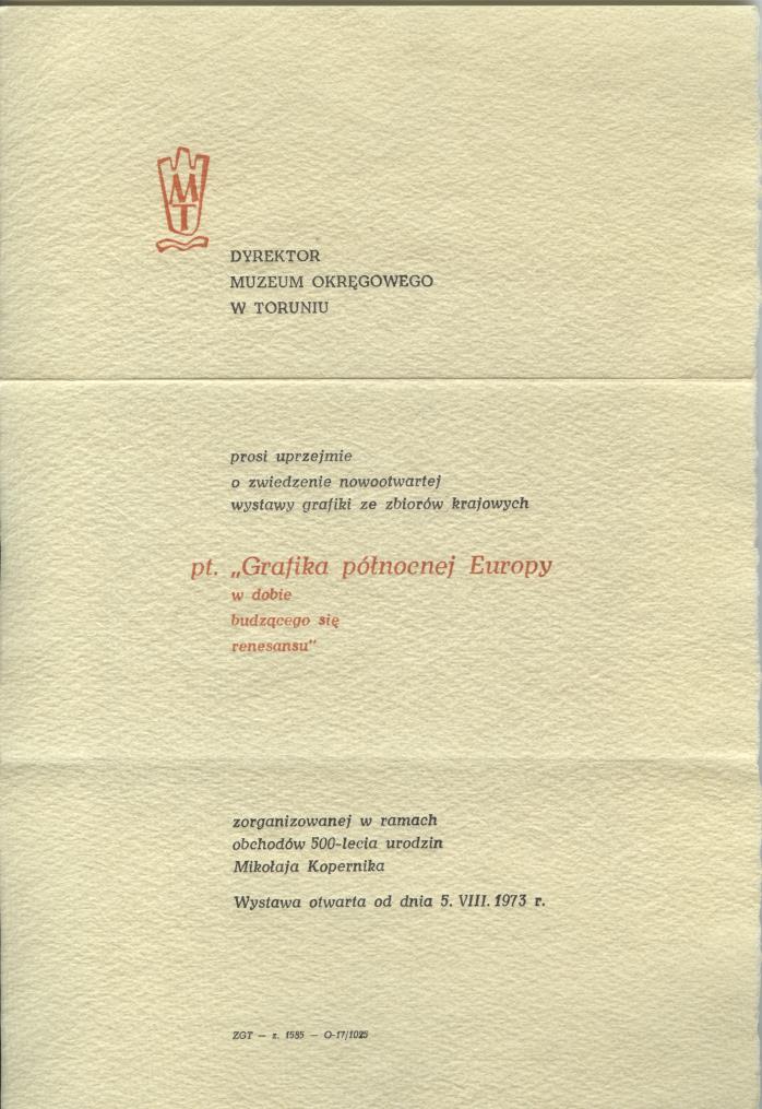 Zaproszenie do zwiedzania wystawy pt. “Grafika północnej Europy w dobie budzącego się renesansu”, od 5 sierpnia 1973 r. w Muzeum Okręgowym w Toruniu.