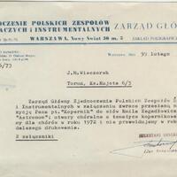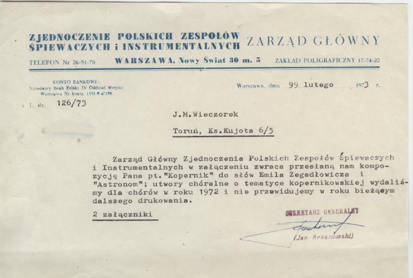 Odpowiedź Zarządu Głównego Zjednoczenia Polskich Zespołów Śpiewaczych i Instrumentalnych w sprawie dodruków utworów chóralnych Jana Wieczorka pt. “Kopernik” i “Astronom”. Kompozycje te pochodziły z “Tryptyku Kopernikańskiego” na cztery głosy dziecięce do słów Emila Zegadłowicza