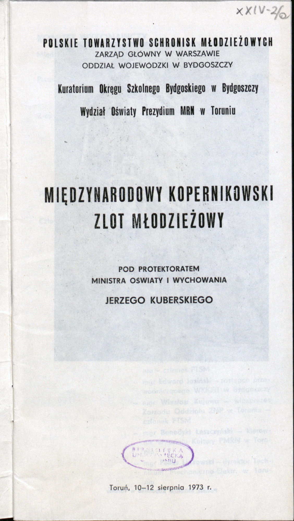 Pod protektoratem Ministra Oświaty i Wychowania Jerzego KuberskiegoZawiera spis Komitetu Wykonawczego Zlotu oraz teksty o działalności Polskiego Towarzystwa Schronisk Młodzieżowych i Roku Kopernikowskim w Toruniu
