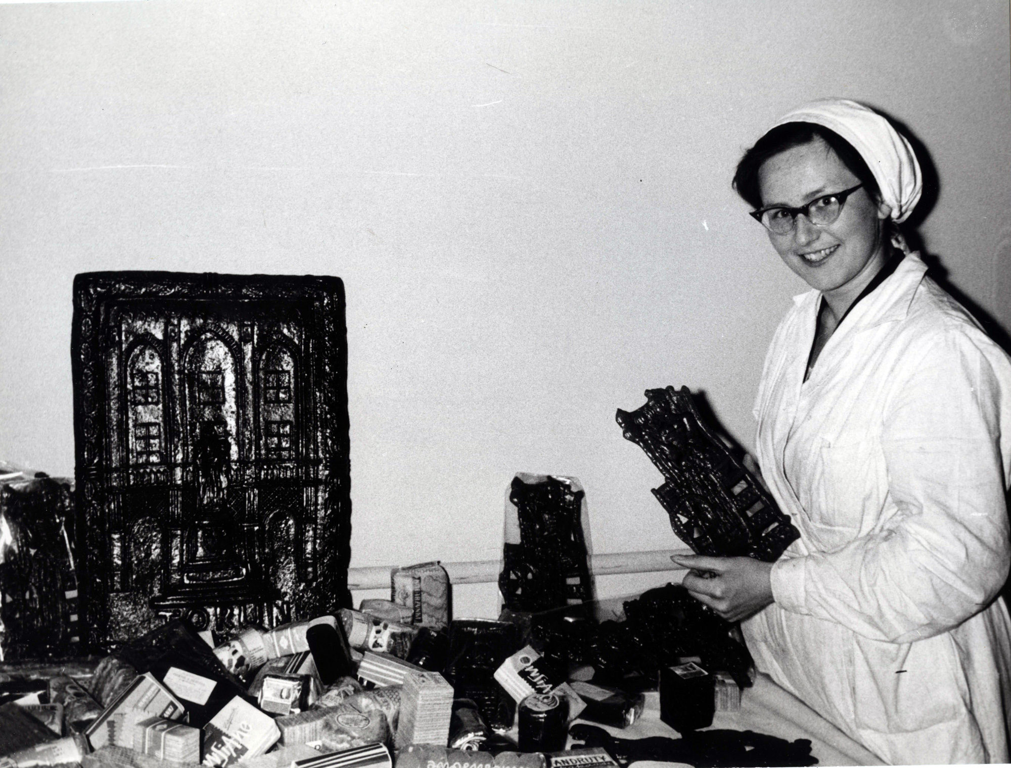 - Fotografia przedstawia pracownicę Fabryki Pierników Kopernik prezentującą wypieki