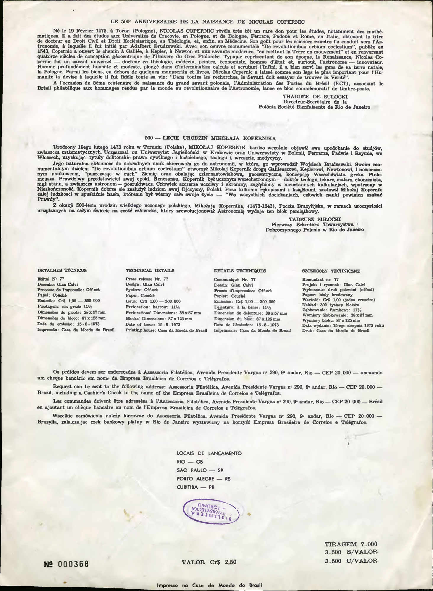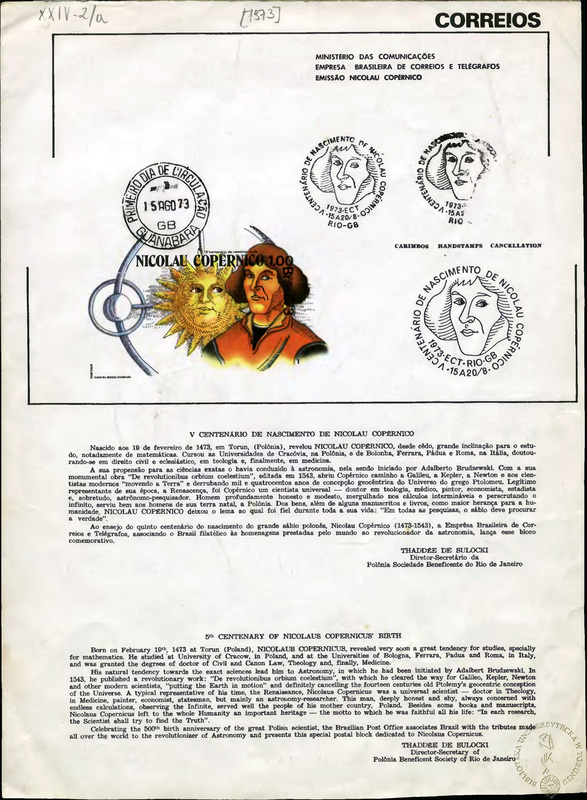 - Blok pamiątkowy Poczty Brazylijskiej wydany z okazji 500. rocznicy urodzin Mikołaja Kopernika
