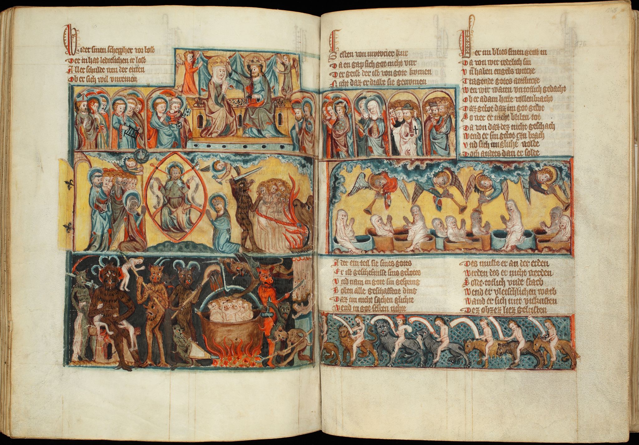 Biblioteka UMK, Rps 44/III, k. 175v-176r: miniatura "Koronacja Marii i Sąd Ostateczny"