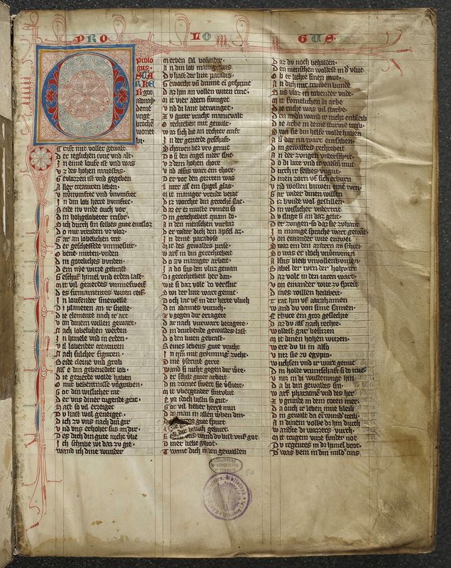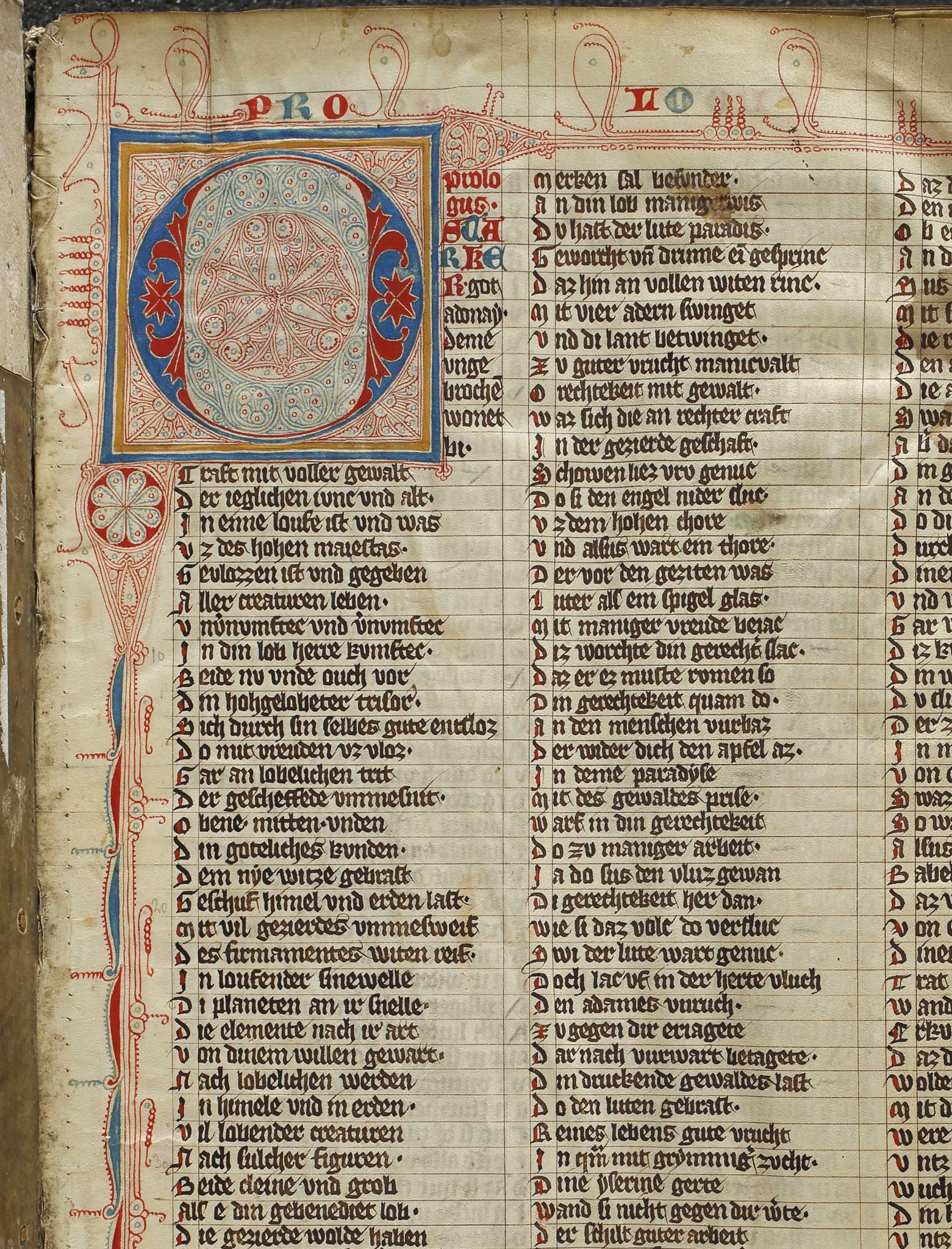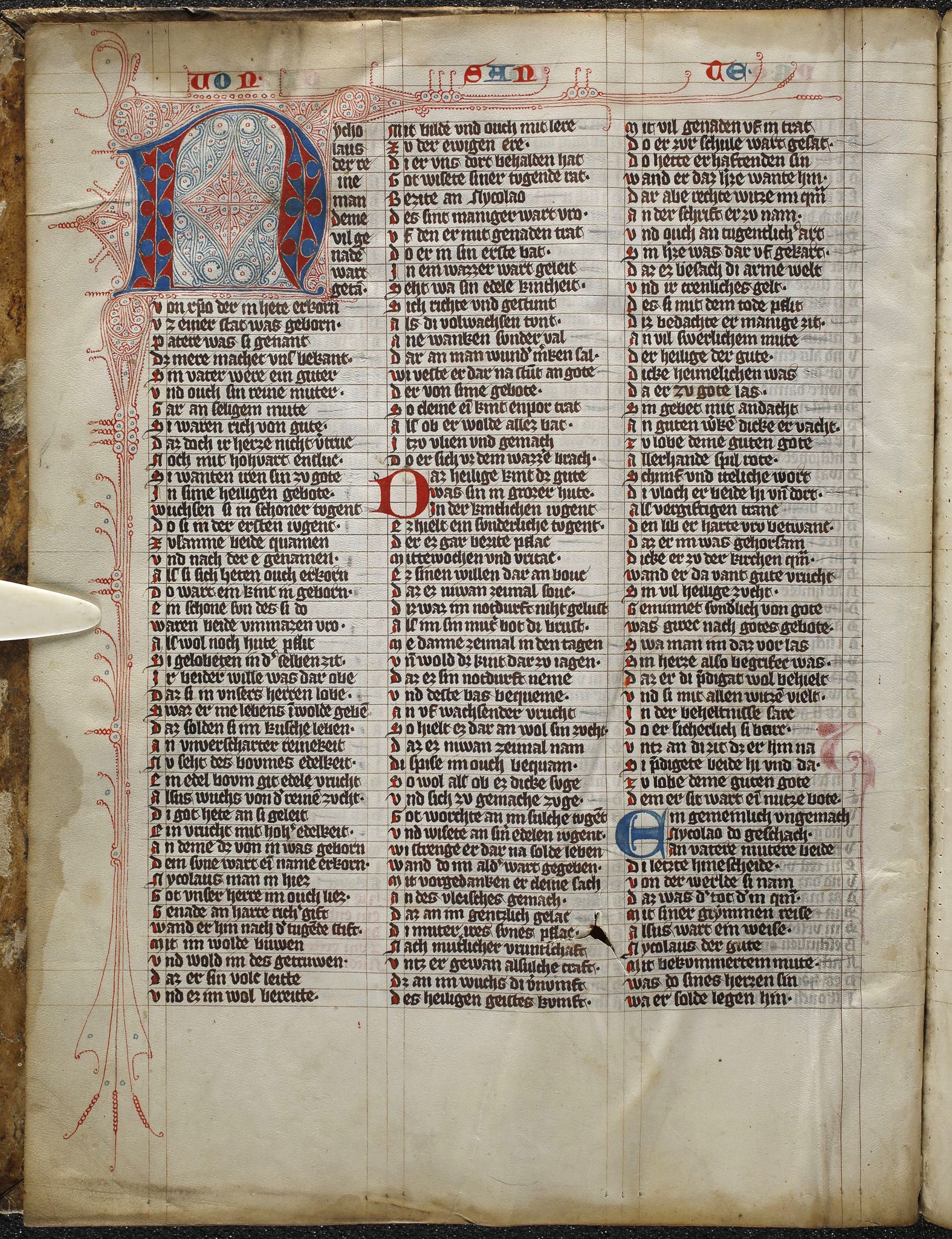 Zdobienia: dwa większe inicjały filigranowe, czerwono-błękitne, rozpoczynające prolog i pierwszy rozdział Pasjonału, k. 1v: O (starker got), 12 wersów, k. 2v: N(ycholaus), 10 wersów.