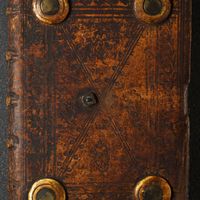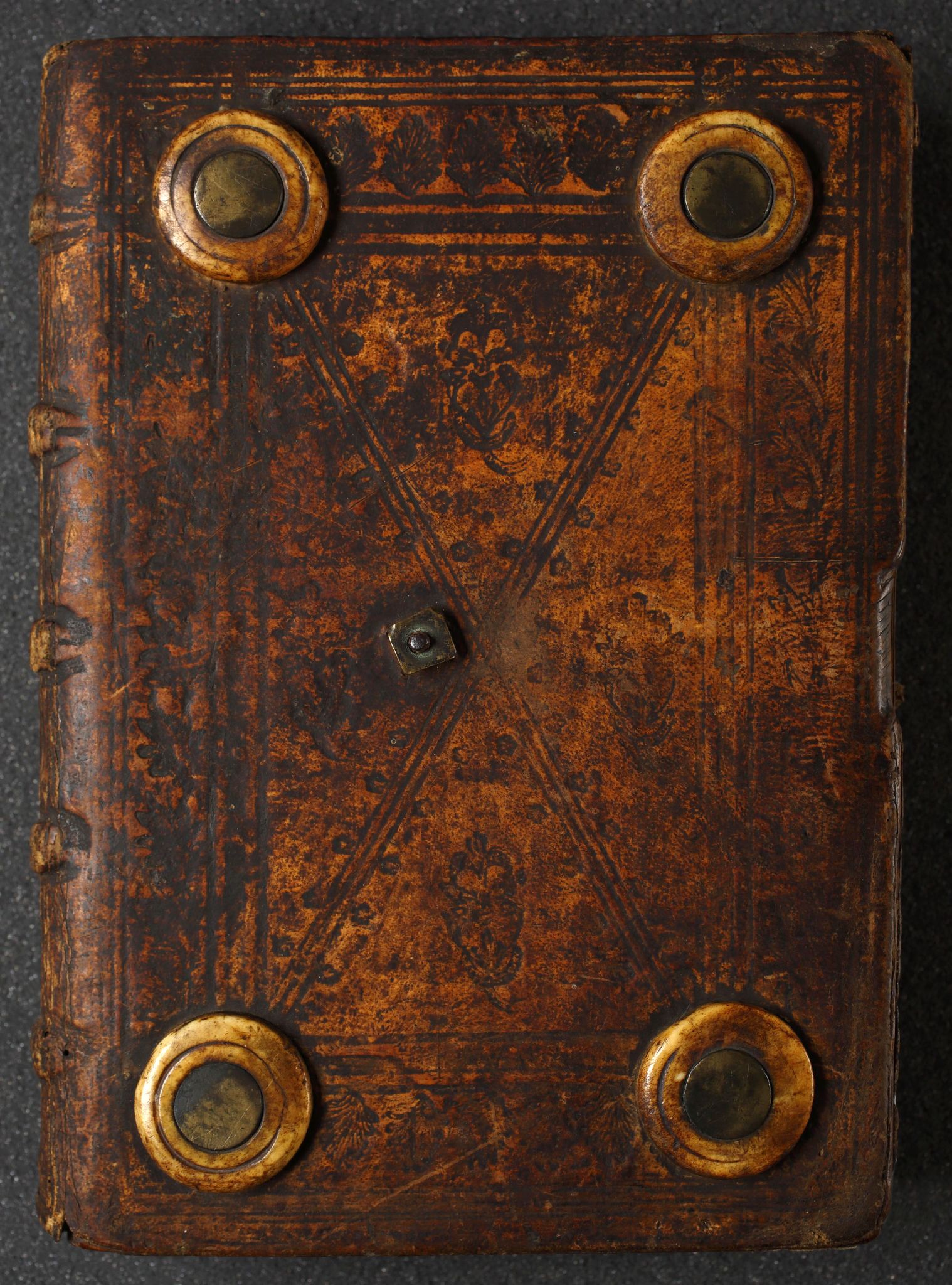 Oprawa: deski bukowe, skóra jasna, guzy kościane na obu okładzinach, zapięcie uszkowe na pasku skórzanym z bolcem na górnej okładzinie (zachowany bolec i blaszka mocująca). Dekoracja okładzin o kompozycji ramowej ze zwierciadłem, ślepo wyciskana strychulcem i tłokami z motywami floralnymi.