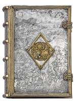 Srebrna oprawa z kolekcji Albrechta Hohenzollerna i jego żony Anny Marii - Ob.6.II.4497 Górna i dolna okładzina bardzo do siebie zbliżone. Pośrodku okładzin medaliony ujęte w wieniec z liści laurowych, otoczony wypukłym trybowanym obramieniem z głowami lwów, maskami, owocami i stylizowanymi liśćmi. Na górnej okładzinie w środku medalionu uzbrojony jeździec na wspiętym koniu, ścinający pień drzewa, na dolnej okładzinie jeździec w zbroi na koniu skaczącym w przepaść.