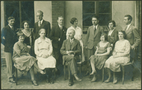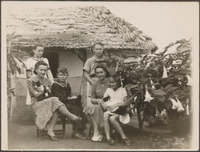 Przed domkiem w Tengeru Zdjęcie przedstawia m. in. Olgę Trybuchowską (1906-1986) na tle domków, w których w Tengeru mieszkano. Kolekcja Muzeum Oświaty w Bydgoszczy -