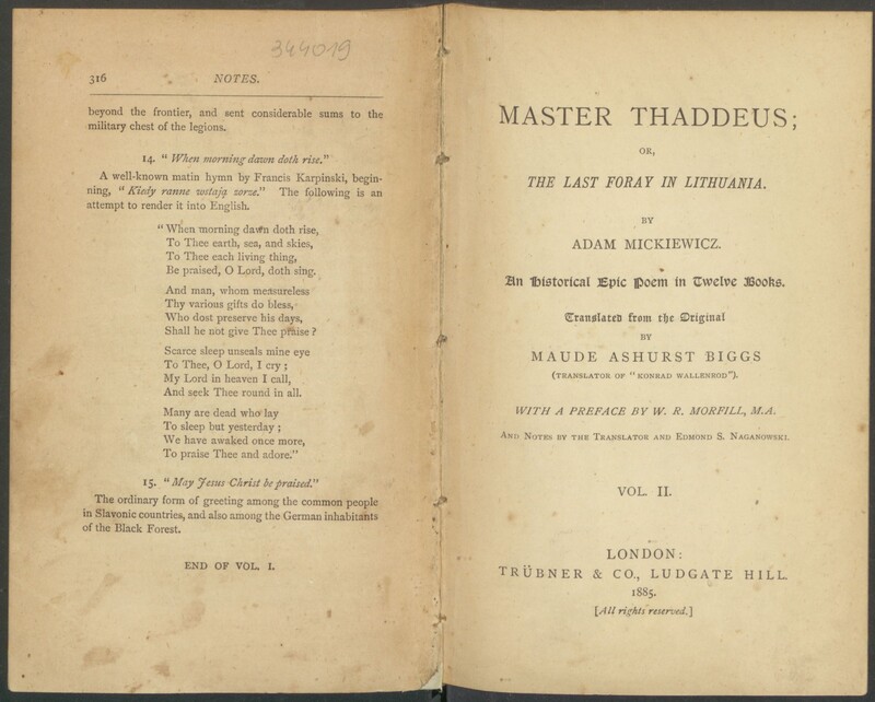 Vol. 1- 2. Translated from the original by Maude Ashurst Biggs with a preface by W. R. Morfill and notes by the translator and Edmond S. Naganowski. Londyńskie wydanie przekładu Pana Tadeusza z 1885 r.