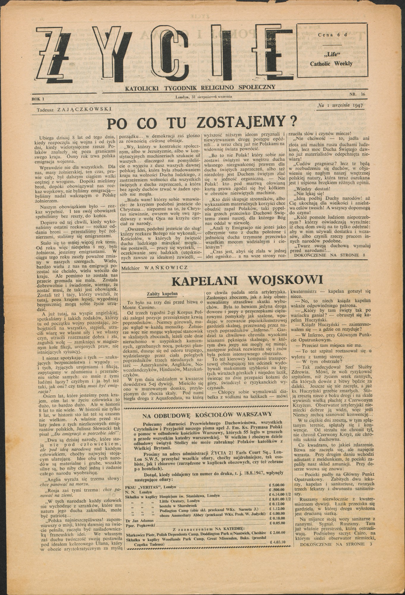 Życie : katolicki tygodnik religijno-społeczny 1947, R. 1 nr 16