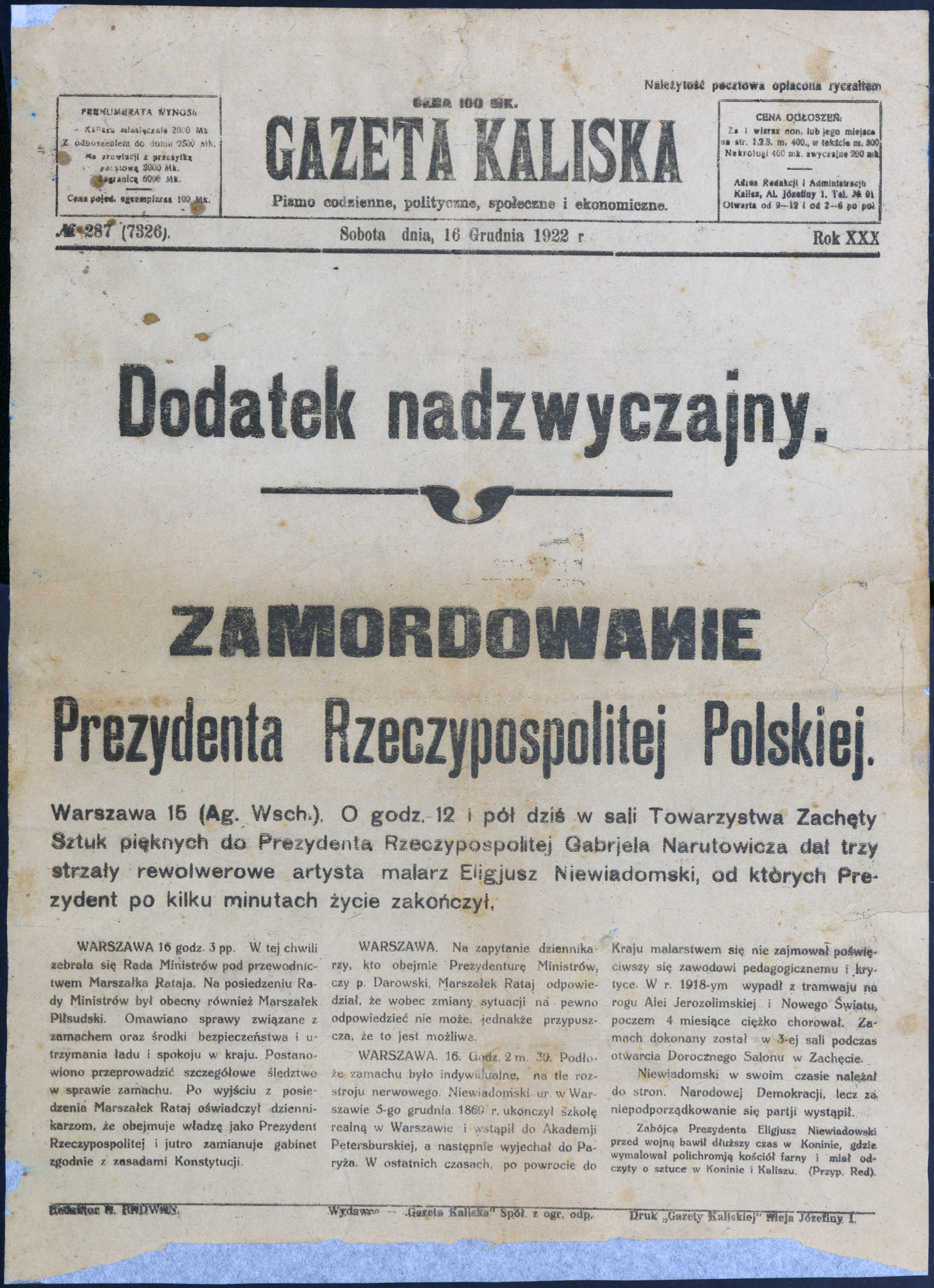 - Zamordowanie Prezydenta Rzeczypospolitej Polskiej ; Gazeta Kaliska : Dodatek nadzwyczajny