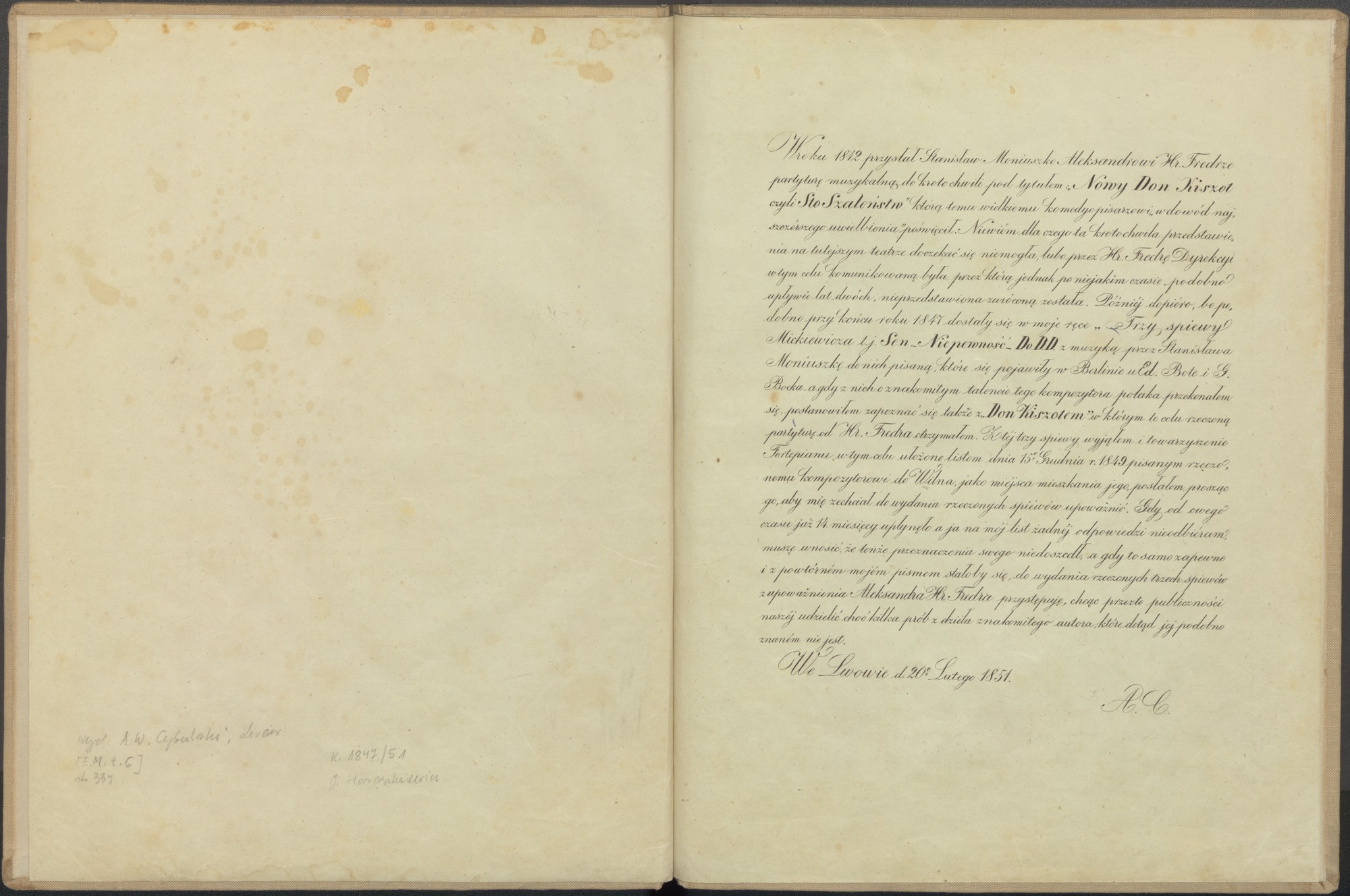 Egzemplarz Trzech Śpiewów z krotochwili Nowy Don Kiszot Stanisława Moniuszki z 1851 r., uznany z dużym prawdopodobieństwem jako jedyny pierwodruk Moniuszkowski wydany poza jego wiedzą, za życia kompozytora. Druk w układzie na głos z towarzyszeniem fortepianu został wykonany w pięknej litografii Marcina Jabłońskiego. Redaktorem i nakładcą edycji był lwowski działacz muzyczny Adam W. Cybulski, który czynił starania, aby wystawić Don Kiszota we Lwowie, niestety bez powodzenia. Przed tekstem muzycznym wylitografowany został komentarz, objaśniający okoliczności i cele wydania.