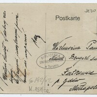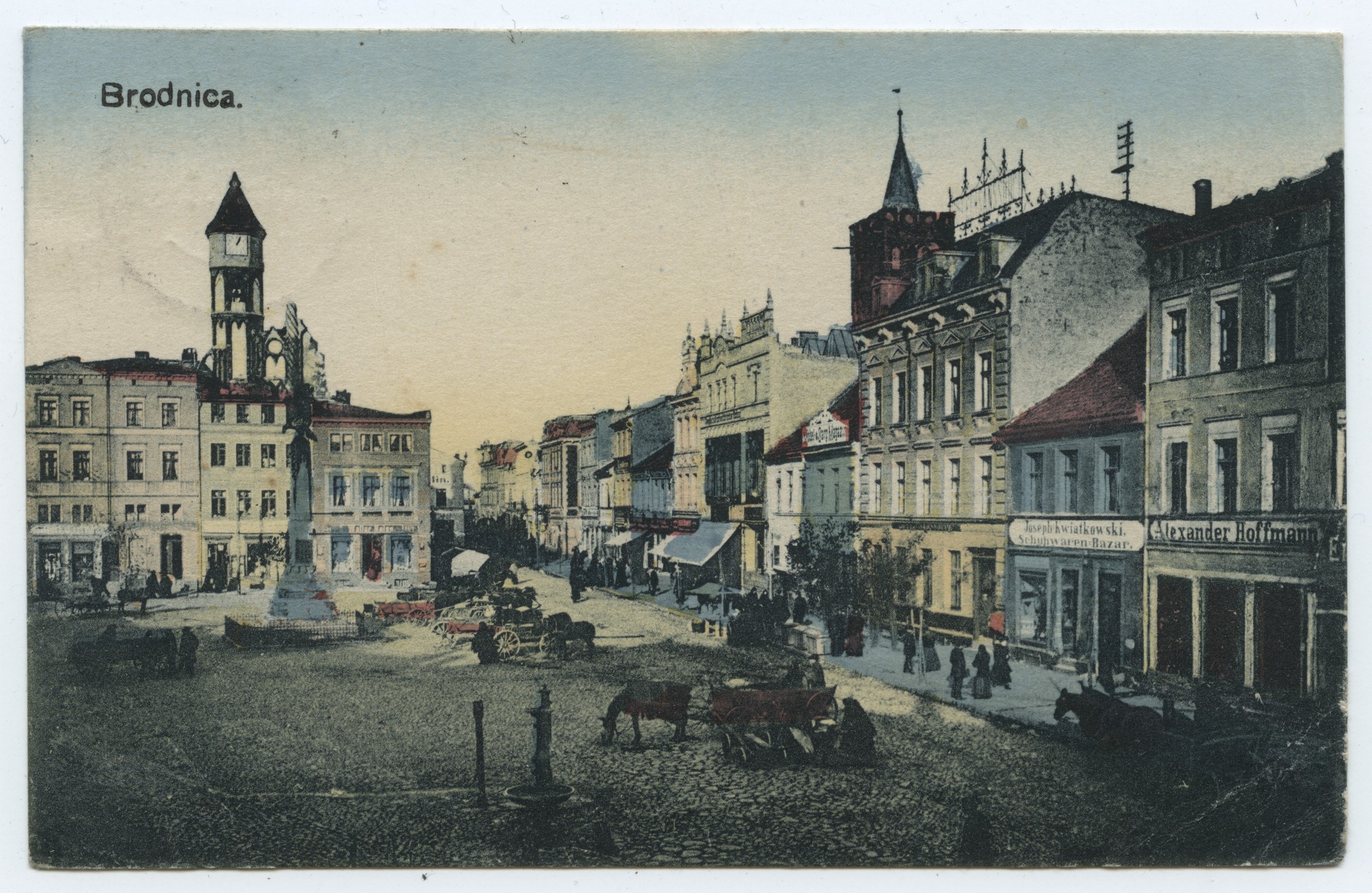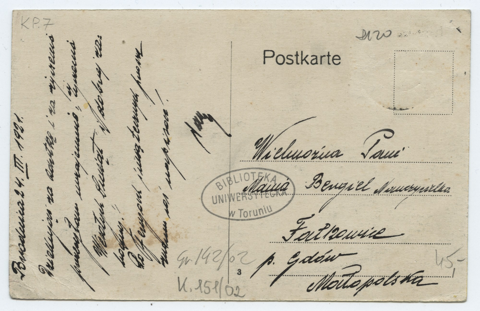 - Widok na Duży Rynek (dawny plac targowy) z wieżą ratuszową oraz nieistniejącym już pomnikiem wojennym po lewej stronie. Na rewersie: adres i korespondencja w języku polskim. W prawym górnym rogu widoczny ślad po okrągłej pieczątce. Data na podstawie korespondencji.