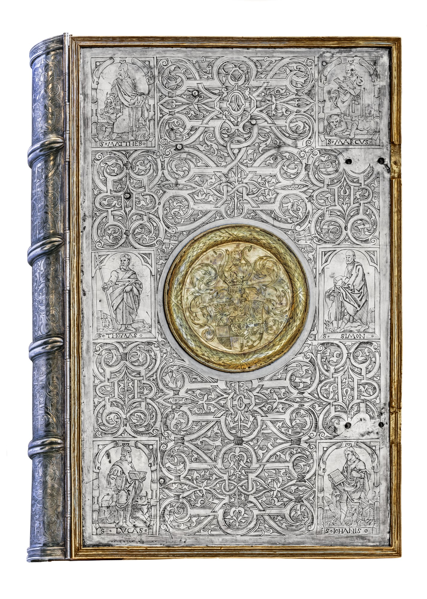 Pośrodku górnej okładziny medalion z herbem księcia Albrechta. W centrum dolnej okładziny medalion z herbem księżnej Anny Marii.