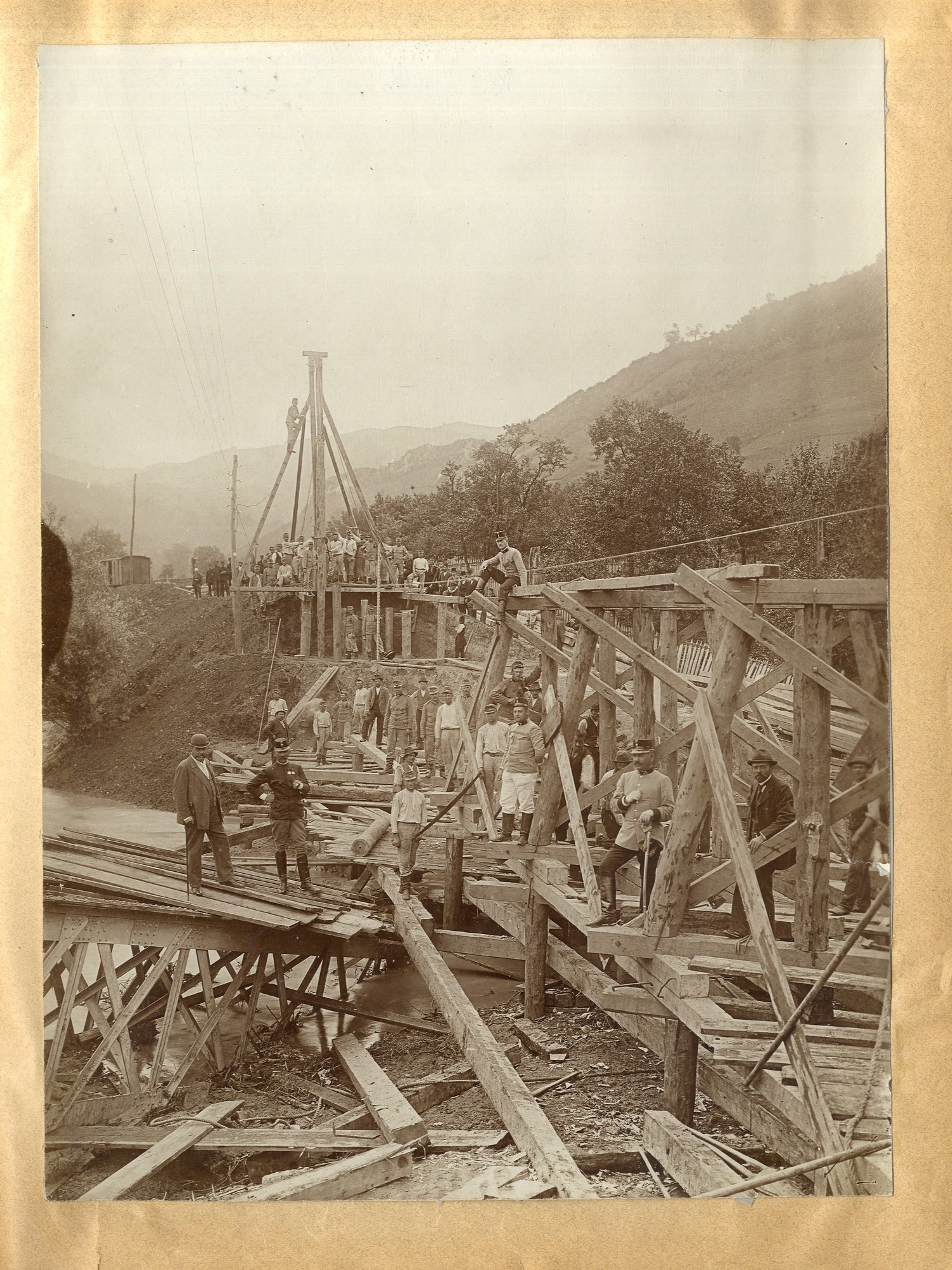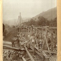 - Zdjęcie przedstawia bardzo dużą grupę pracowników na odbudowywanym moście kolejowym w górach. Po lewej stronie, w mundurze austo-węgierskim, Józef Trajtler.